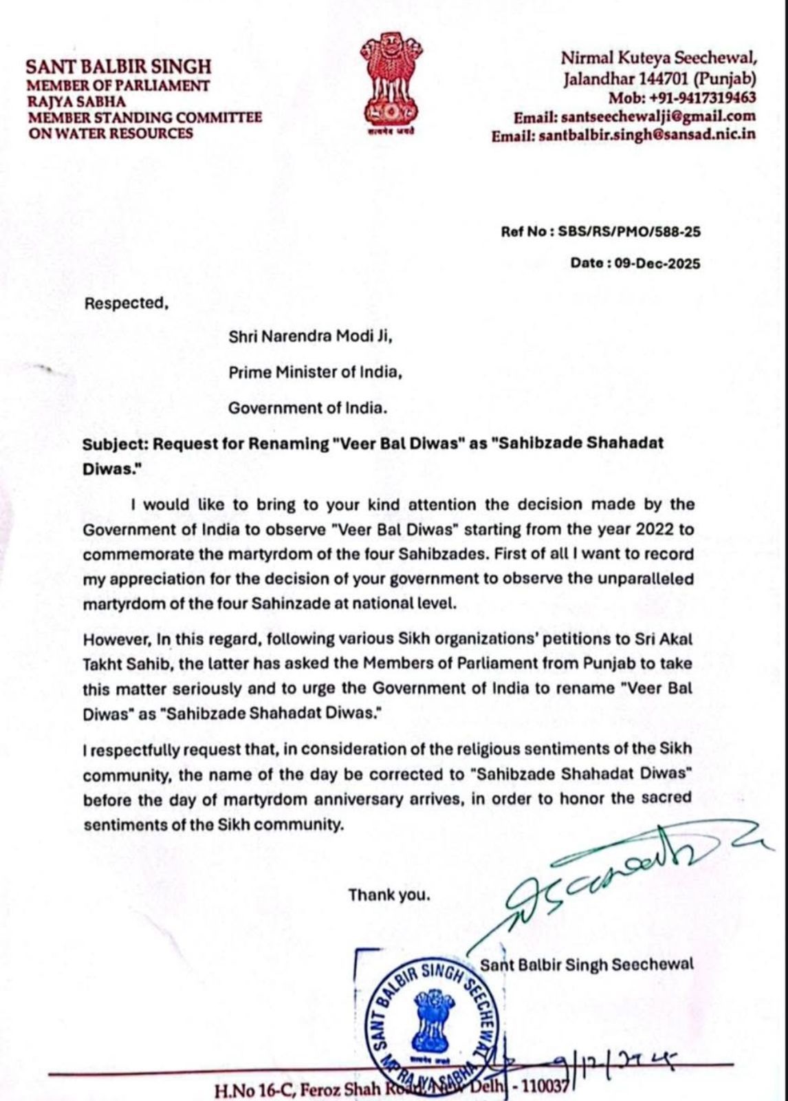 Chandigarh:The Punjab government, led by Chief Minister Bhagwant Mann, has strongly urged the central BJP government to respect Sikh sentiments. MP Sant Balbir Singh Seechewal wrote to Prime Minister Narendra Modi, demanding that ‘Veer Bal Diwas’ be renamed as ‘Sahibzade Shahadat Diwas’ to honor the martyrdom of the four Sahibzades. The Punjab government criticized the Centre for ignoring the religious sentiments of the Sikh community and not giving due respect to Punjab’s glorious history, emphasizing that this step is essential to preserve the state’s cultural and religious identity.