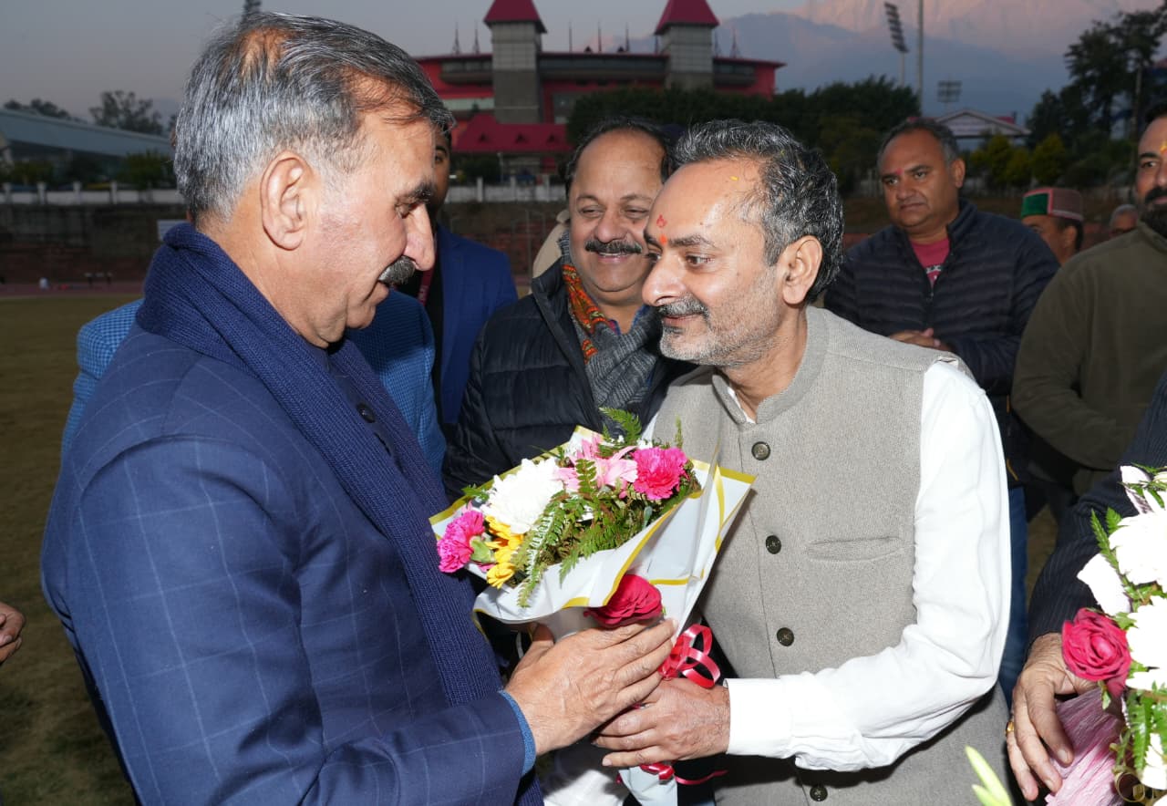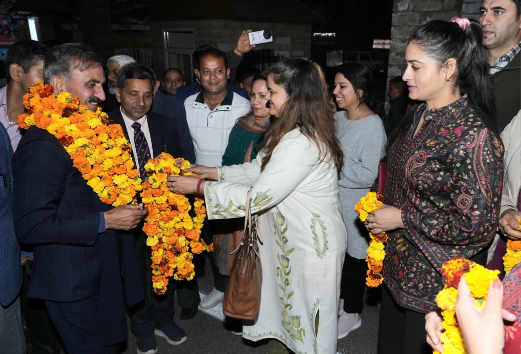 Shimla: Chief Minister Thakur Sukhvinder Singh Sukhu was accorded a warm welcome upon his arrival at Dharamshala in Kangra district today by Ayush Minister Yadvinder Goma, Deputy Chief Whip Kewal Singh Pathania, former MLA Surender Kaku, HRTC Vice Chairman Ajay Verma, HPBOSE Chairman Dr. Rajesh Sharma, APMC Kangra Chairman Nishu Mongra, Congress leader Devender Jaggi, Deputy Commissioner Hemraj Bairwa, Superintendent of Police Mayank Choudhary, Congress leaders and other people.