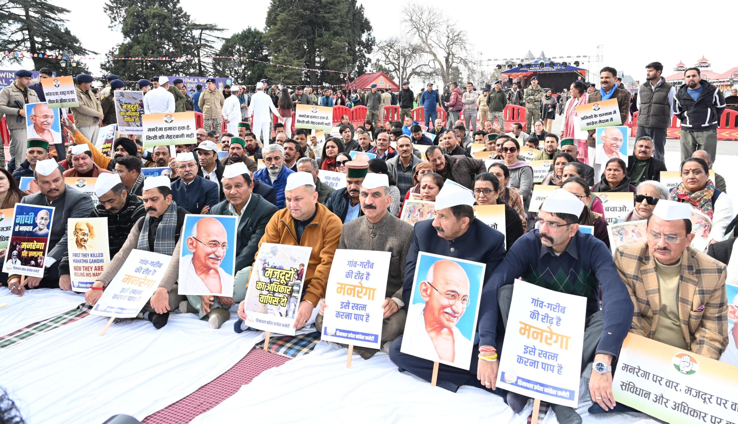 Shimla: Chief Minister Thakur Sukhvinder Singh Sukhu on Monday, along with members of his Cabinet, staged a protest near the statue of Mahatma Gandhi at the Ridge, Shimla, opposing the Central Government’s decision to discontinue the MNREGA scheme.
