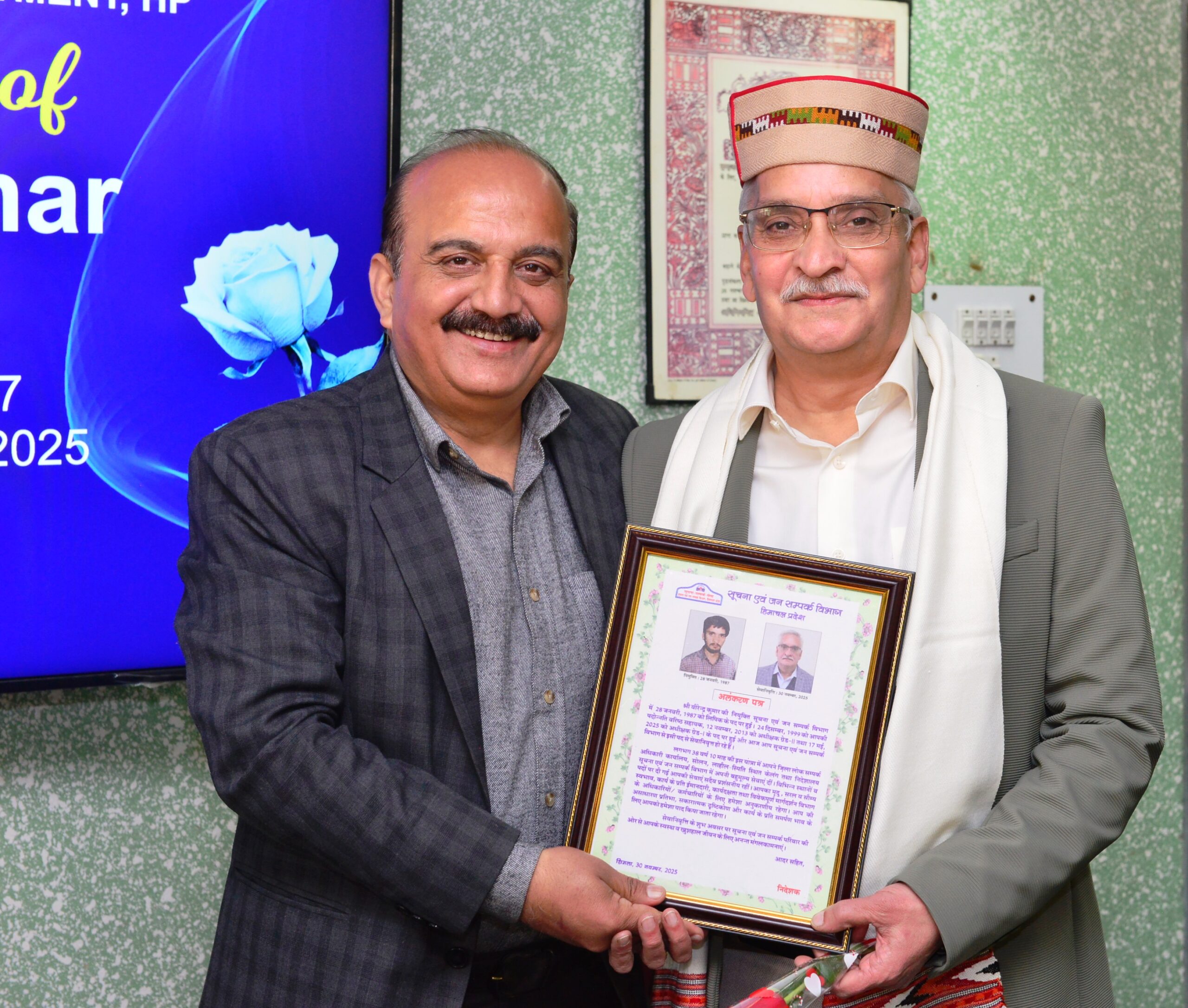 Shimla: A warm farewell ceremony was held today at the Directorate of Information and Public Relations to honour Senior Superintendent Grade-I Virender Thakur on his retirement.