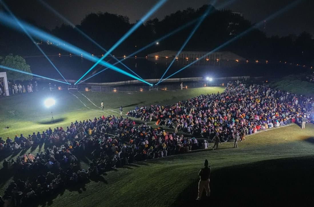 Over three thousand drones lit up the night sky, creating shining images that told the story of Guru Tegh Bahadur Ji’s life and his sacrifice for the freedom of faith. As the darkness fell, the drones rose together to form the holy Khanda Saab symbol, glowing like gold in the night sky. The crowd watched in awe and reverence.