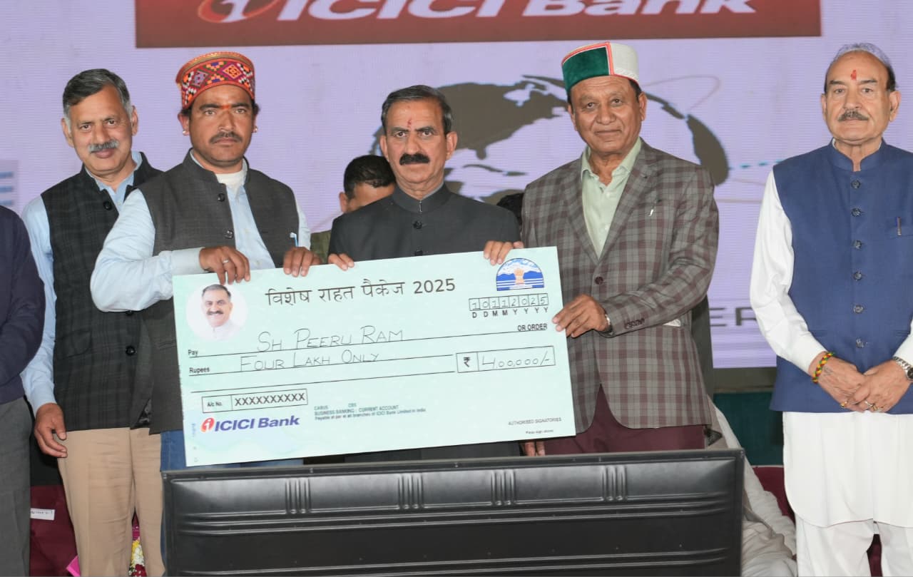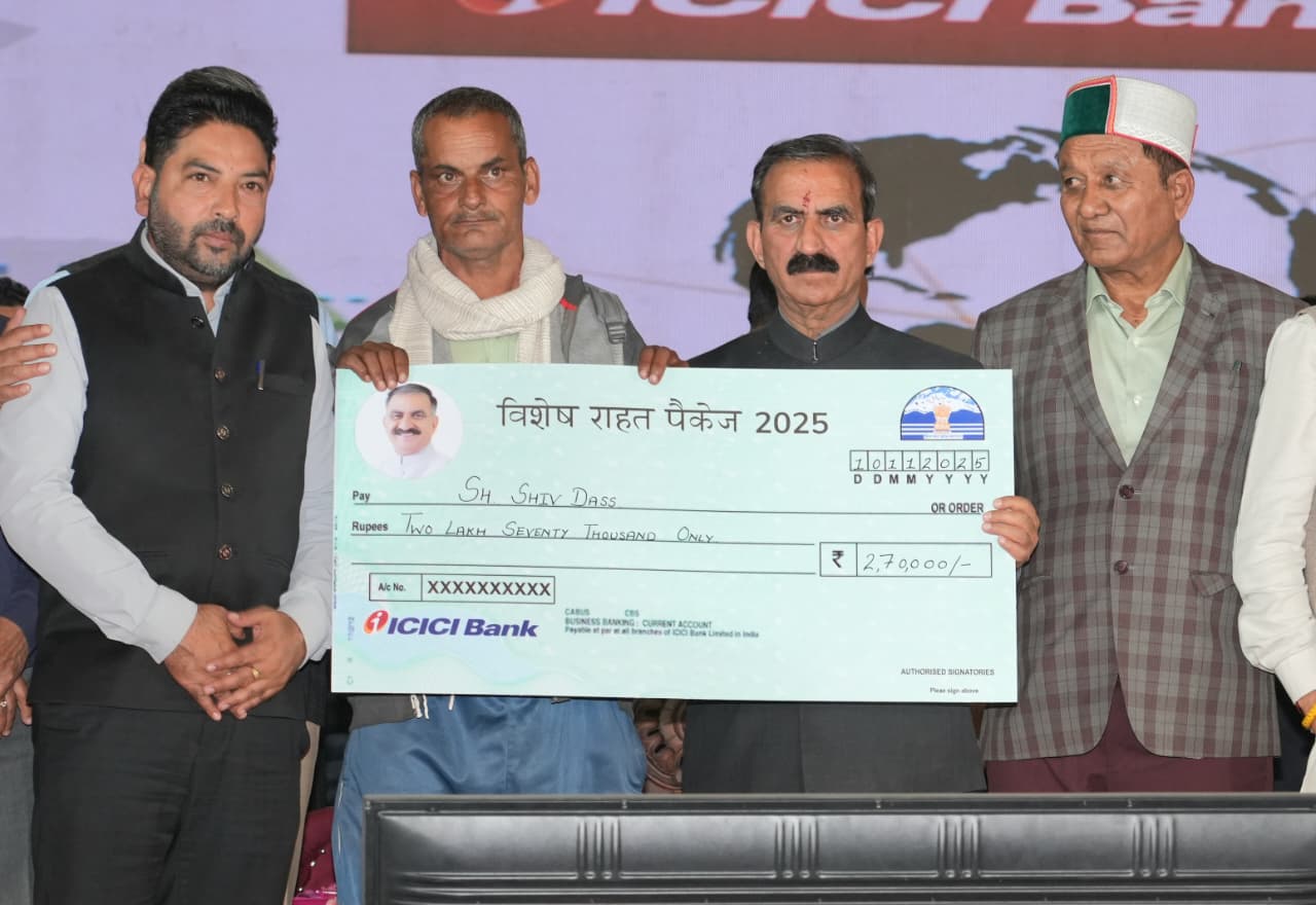 During the event, the Chief Minister presented a cheque of Rs. 7.95 lakh to Nikita, a young girl who lost her parents in the floods at Panglyur in the Seraj Assembly constituency. He also announced an additional financial assistance of Rs. 21 lakh for her. He said that daughters like Nikita are not alone anymore and the state government stands with them.