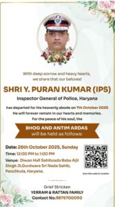 Panchkula (Haryana): The Bhog and Antim Ardaas ceremony of Late Shri Y. Puran Kumar, IPS, will be held on Sunday, October 26, 2025, from 12:00 PM to 1:00 PM at the Diwan Hall, Sahibzada Baba Ajit Singh Ji, Gurdwara Sri Nada Sahib, Panchkula (Haryana).