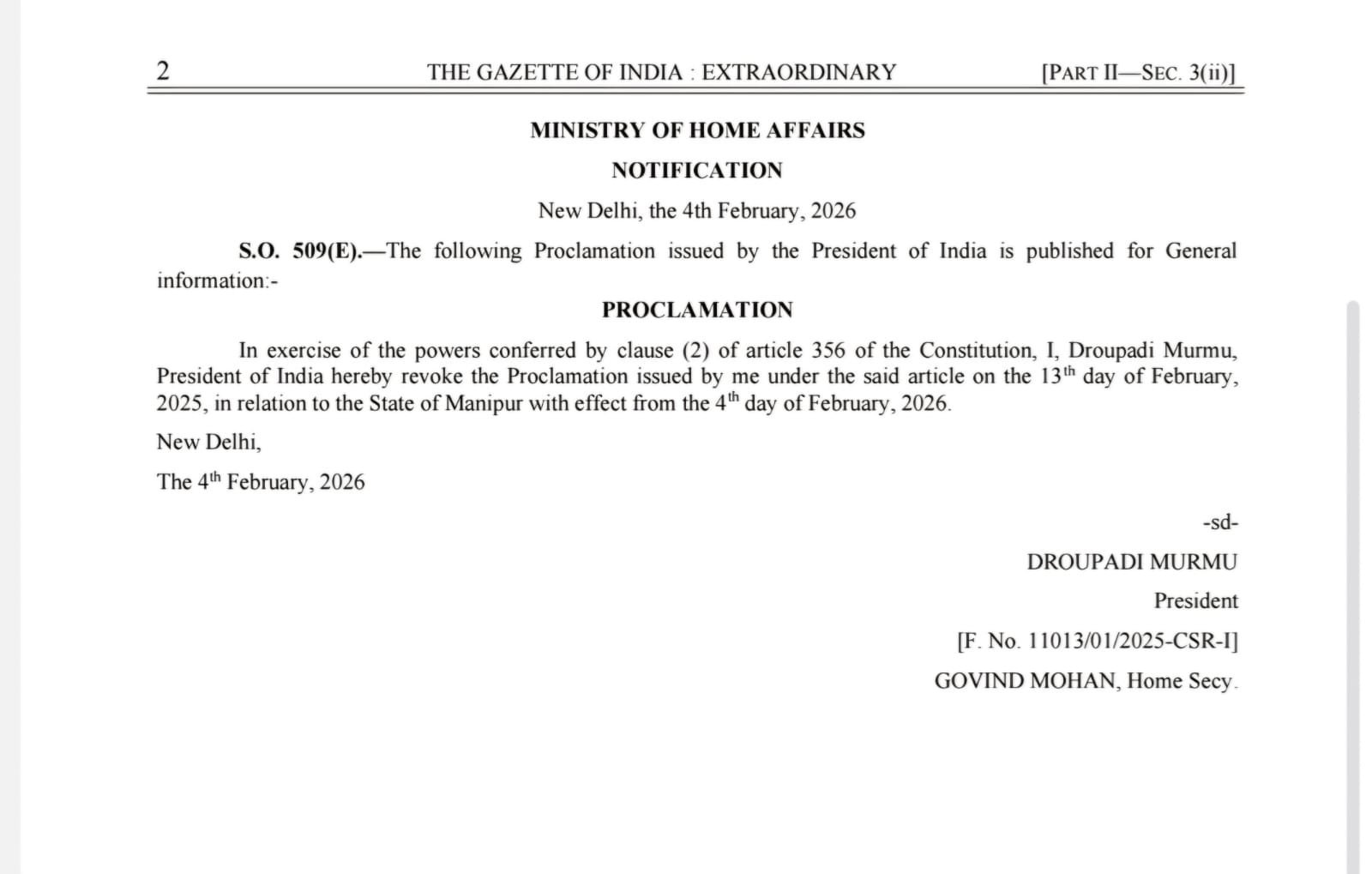 New Delhi: The Ministry of Home Affairs on Tuesday issued a notification announcing the revocation of President’s Rule in Manipur with immediate effect. The proclamation was published in The Gazette of India (Extraordinary) and takes effect from February 4, 2026.