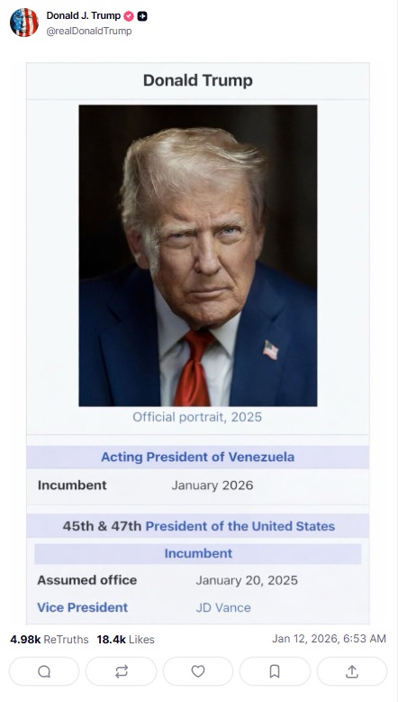 Washington/Caracas: US President Donald Trump has triggered widespread debate after sharing a viral post declaring himself the “Acting President of Venezuela” starting January 2026. The image, designed to resemble an encyclopaedia-style profile, featured Trump’s official portrait and listed him as both the 45th and 47th President of the United States, alongside the controversial Venezuela claim.
