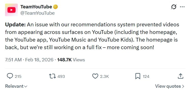 Subsequently, YouTube clarified on its help page that the outage stemmed from an issue within its recommendations system, which prevented videos from appearing across multiple surfaces, including the homepage and main app interface. While the homepage was later restored, engineers continued working toward a full resolution.