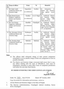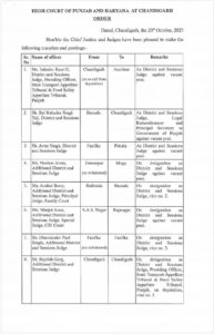 Chandigarh: The Punjab and Haryana High Court issued transfer orders for 13 judges in Punjab on Diwali day, including several District and Sessions Judges as well as Additional Sessions Judges.