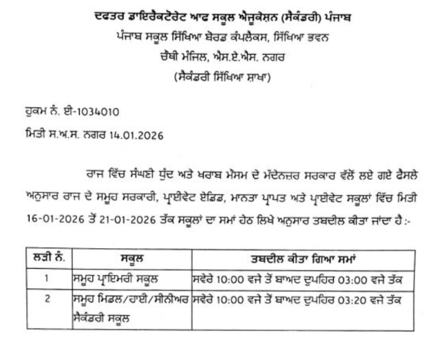 Chandigarh: In view of dense fog and unfavourable weather conditions across the state, the Punjab government has revised the timings of all schools. The new schedule will be effective from January 16 to January 21, 2026, officials said.
