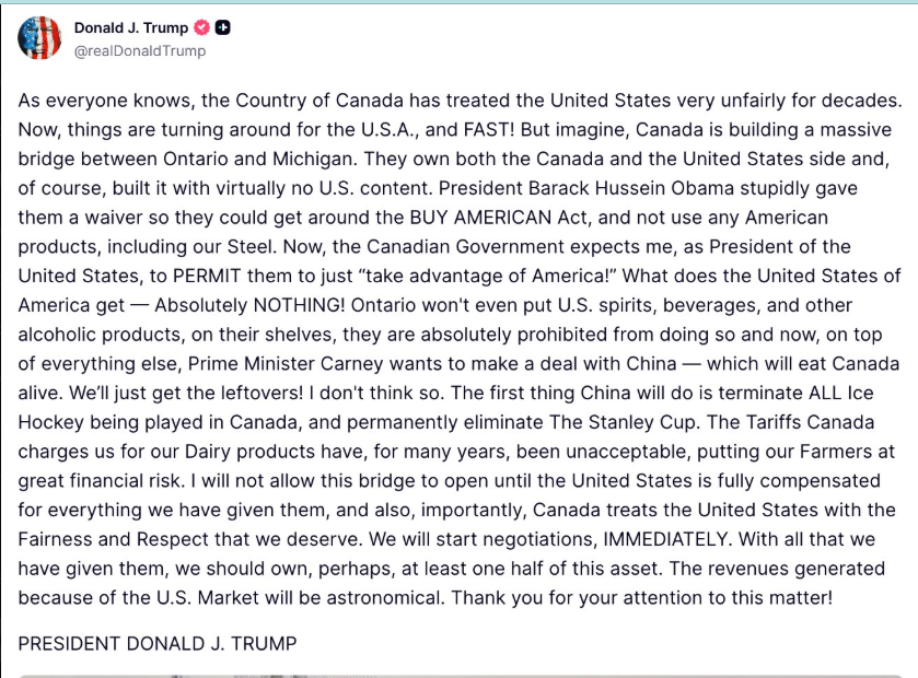 “I will not allow this bridge to open until the United States is fully compensated for everything we have given them,” Trump wrote, adding that negotiations would begin immediately. He also suggested that the US should own at least half of the infrastructure.